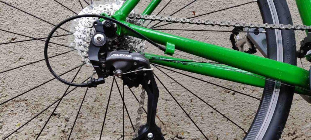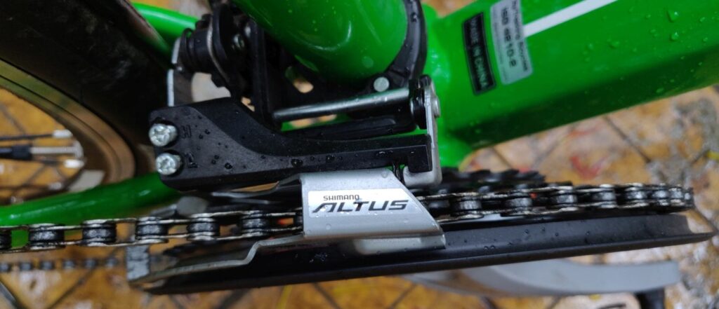 A 2×8 Shimano drivetrain gives a total of 16 speeds. Shifting is crisp and effortless, even on inclines. The front TY606 and rear TY310 derailleurs are budget-oriented but dependable, while the Shimano Altus shifters ensure smooth transitions between gears.