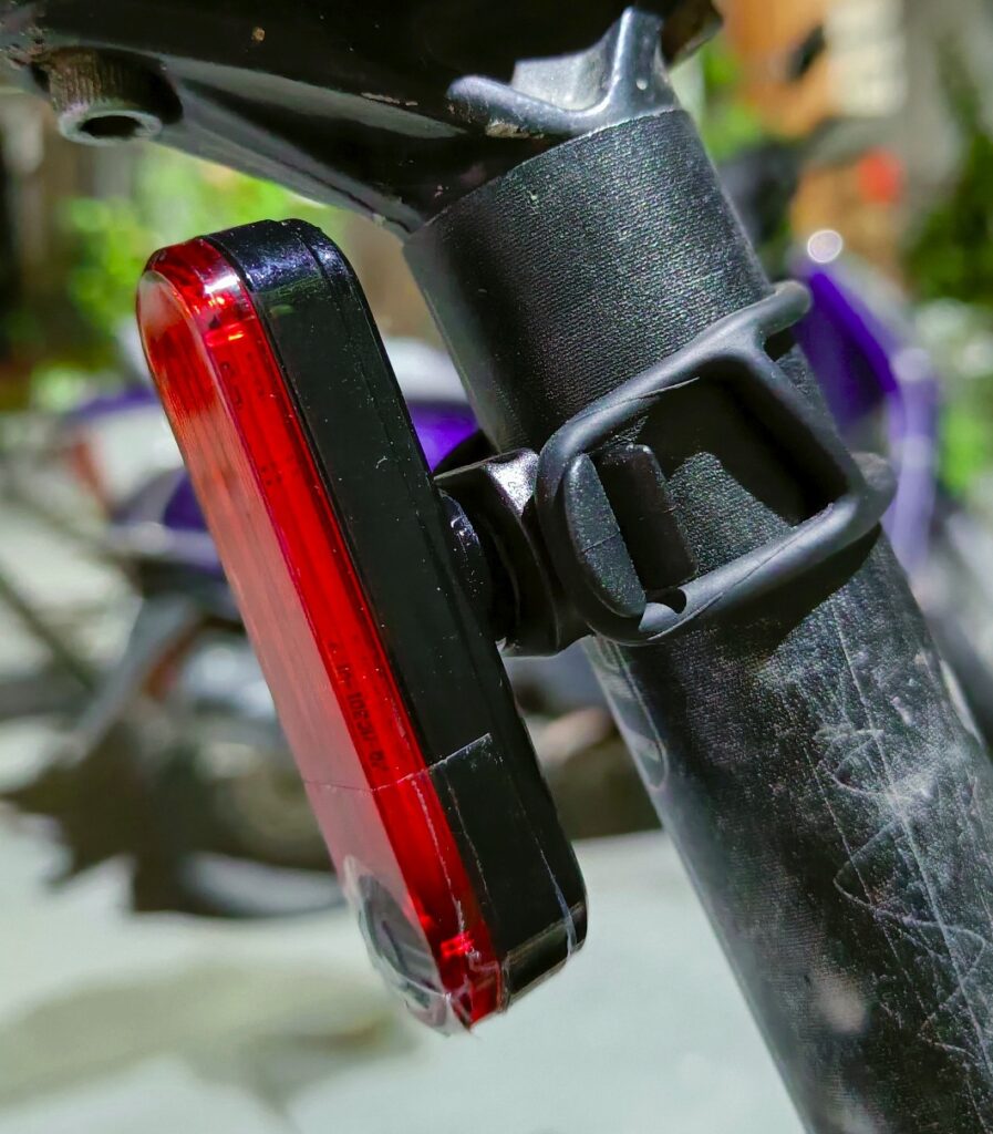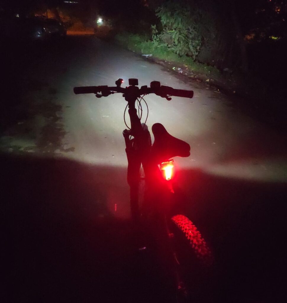 The 400-lumen front light is shockingly bright for its compact build. On high mode, it throws a powerful beam that lights up 20–30 meters ahead — enough to navigate confidently on dark streets or semi-lit trails.